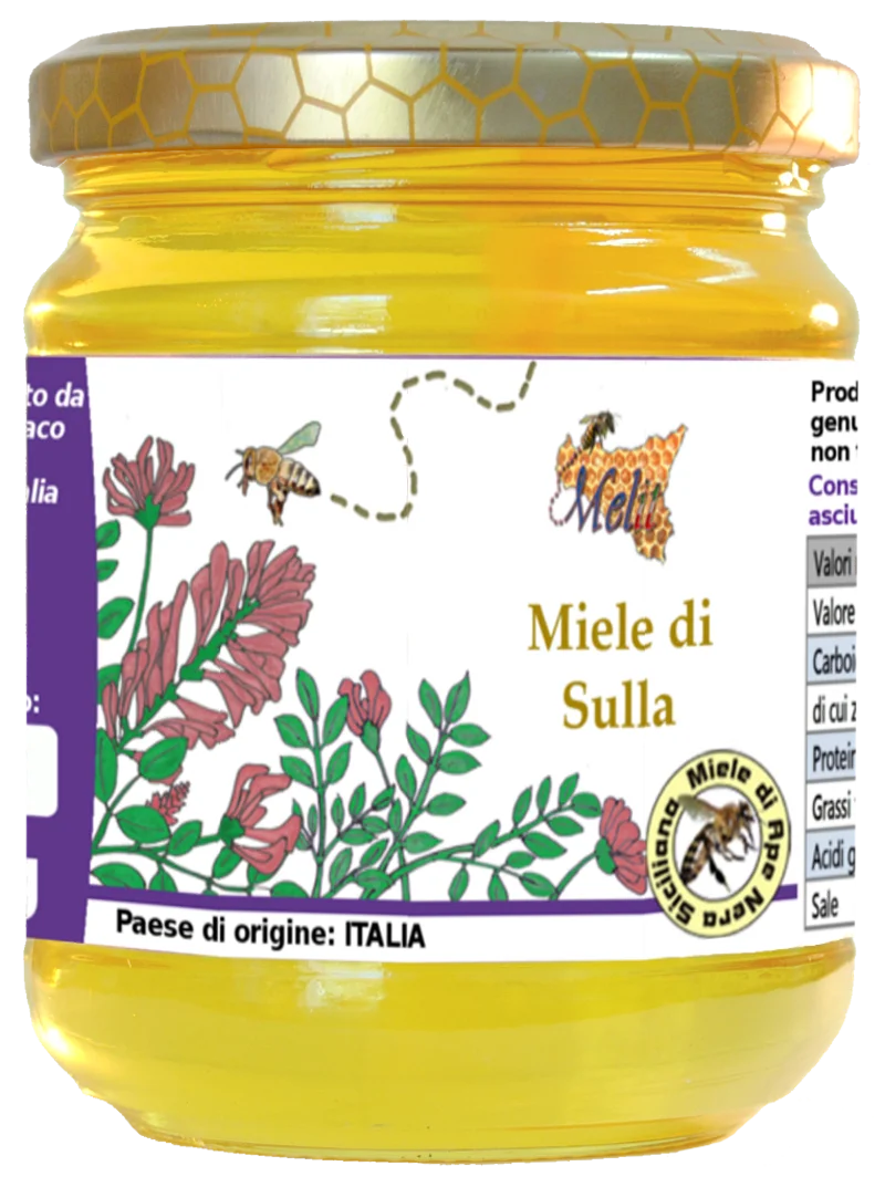 Miele proveniente dal nettare di Hedysarum coronarium, pianta  spontanea di tutti i paesi del bacino del Mediterraneo. L’Italia è l’unico paese dove la specie viene coltivata su superfici significative.